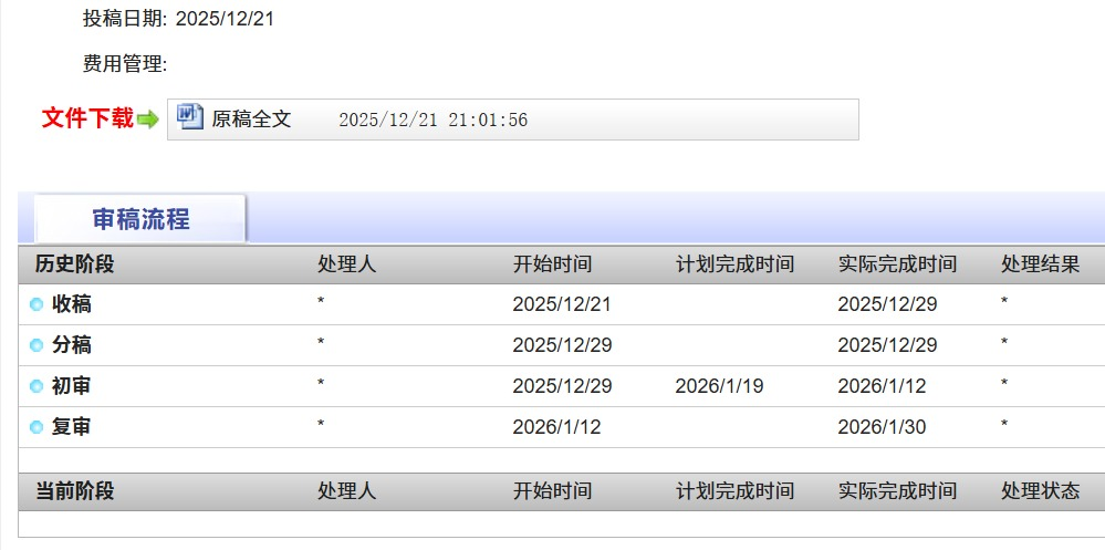 投稿后不久进入收稿阶段,收稿完成后,进入初审,和往常一样,初审过后上面提示有预计处理时间,预计处理时间到后自动退稿。不过,这个系统的投稿是有编辑在看的。这个给编辑工作人员人员,再打磨一下稿件,提升文章质量。