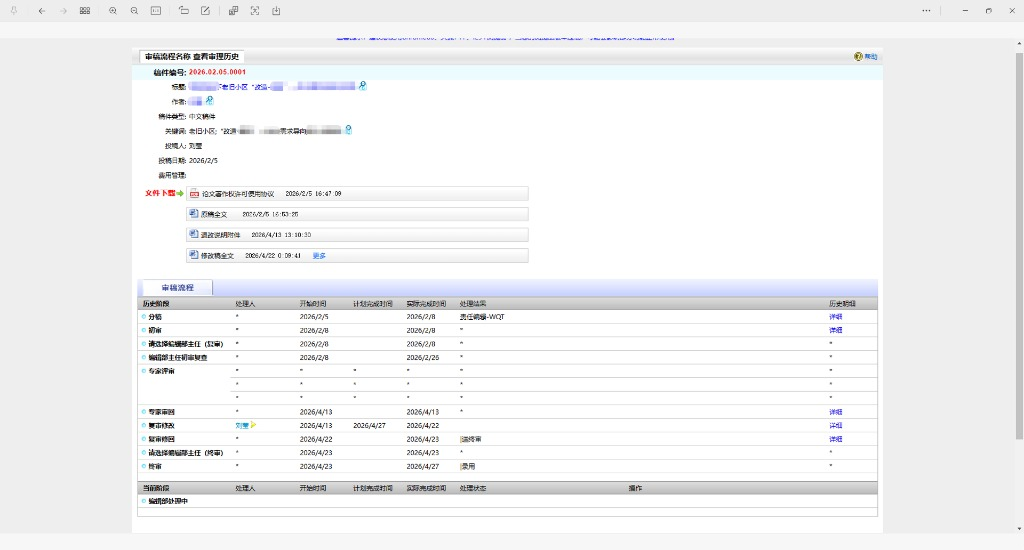 3月1日投稿至系统,4月2日返回修改一审修改意见,4月10号专家复审,4月27日录用并上传授权书。 整体进度较快,值得推荐,后续刊期还没确定,等待进一步通知。