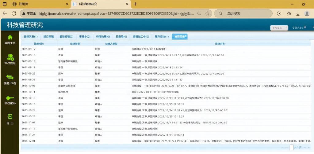 关于最近二三月内投稿至《科技管理研究》期刊的学友,大家陆续有在系统或邮箱收到动态更新吗?我这边9月中下旬投的稿子,为啥迟迟没有消息捏,好着急哇,到底是哪个环节出了问题呢,上来冒个泡问下有没有学友出现类似我这种的情况???