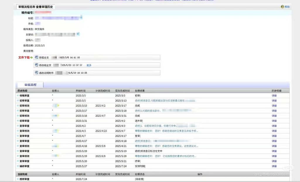 具体时间节点可看配图,从初审到终审将近3个月左右,期间返修3次。投稿时为三无法硕(无导师、无基金、无项目),校审时编辑老师让问导师要一个项目,最后是以硕独+项目发表。那一期法学栏目基本上都是硕士独作,对于硕士而言较为友好。编辑老师很细心也很耐心,在细节处都会和你讨论。这是我第一篇小论文,感谢收留,希望能越办越好。